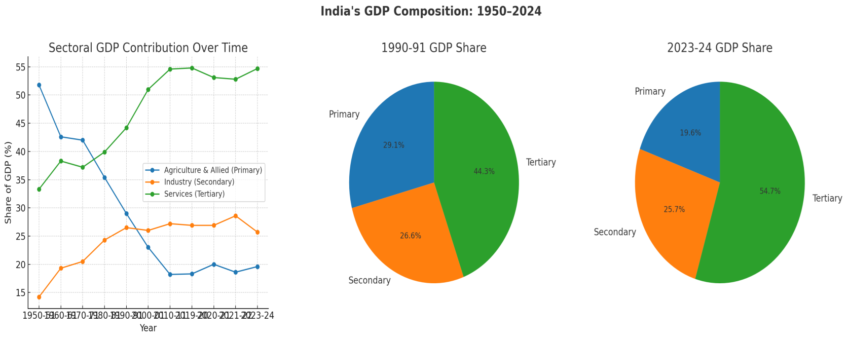 As of the fiscal year 2023–24, the services sector accounted for approximately 54.72% of India’s Gross Value Added (GVA), amounting to ₹146.44 lakh crore out of a total GVA of ₹267.62 lakh crore. This marks a substantial increase from 33% in 1950 and 53% in 2021–22, underscoring the sector’s expanding role in the economy .
