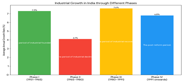 Manufacturing accounts for about 18% of the total Gross Value Added (GVA), while construction accounts for around 8%. The journey of Indian industry can be summed up in four phases:
