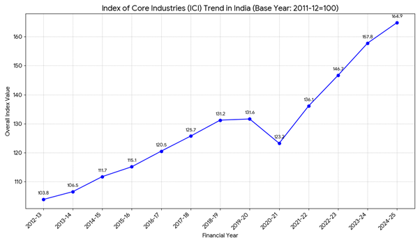 The Index of Industrial Production (IIP) measures the change in the volume of industrial production. The Index of Core Industries (ICI) tracks the growth of eight key industries: refinery products, electricity, steel, coal, crude oil, natural gas, cement, and fertilisers.